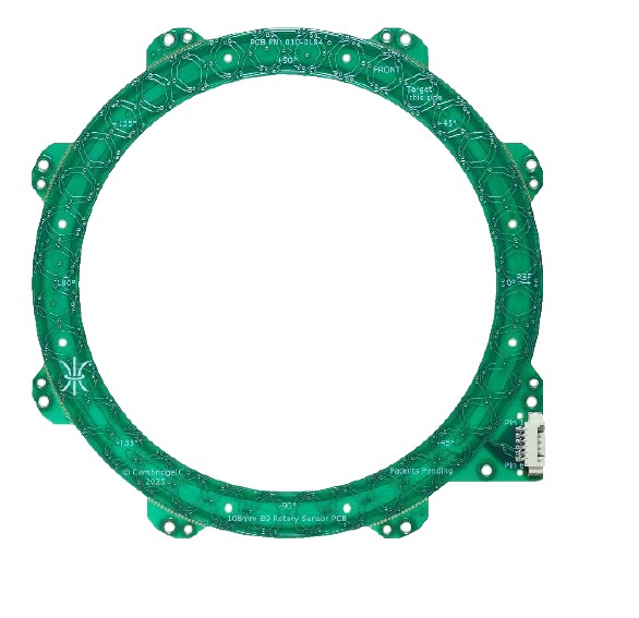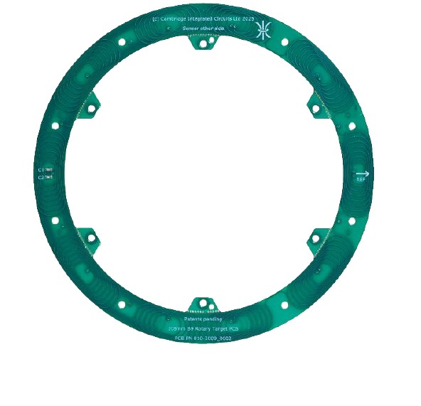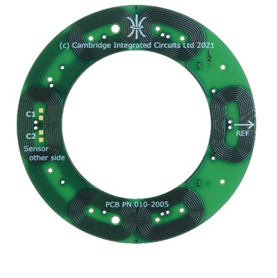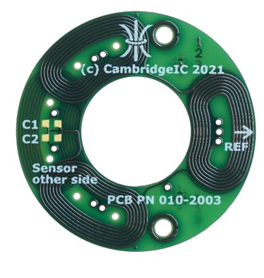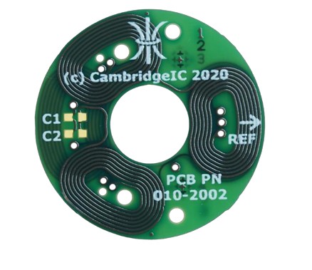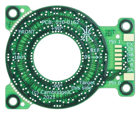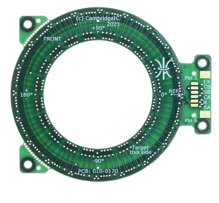 Resonant inductive position sensors and targets for measuring full absolute angle across 360°. The sensor connects to a Resonant Inductive Encoder IC such as the CAM622 to provide high-quality position and velocity data to a host device. The sensor design includes two pairs of PCB coils for detecting the target. Fine coils provide high accuracy and resolution and repeat 3 times around 360°. Coarse coils repeat once around 360° for full absolute measurement of angle. The matching non-contact target design includes a PCB printed resonator coil and SMD capacitor(s). These form a resonant circuit, owered without electrical contact by the sensor’s excitation coil. The resonator coil design is patterned to minimise the effect of misalignments on reported angle. The sensor and target are Type B3, B5 or B9 . “B” refers to the resonator frequency band centred on 833kHz. 3, 5 or 9 are the numbers of fine sensor coil periods per coarse.