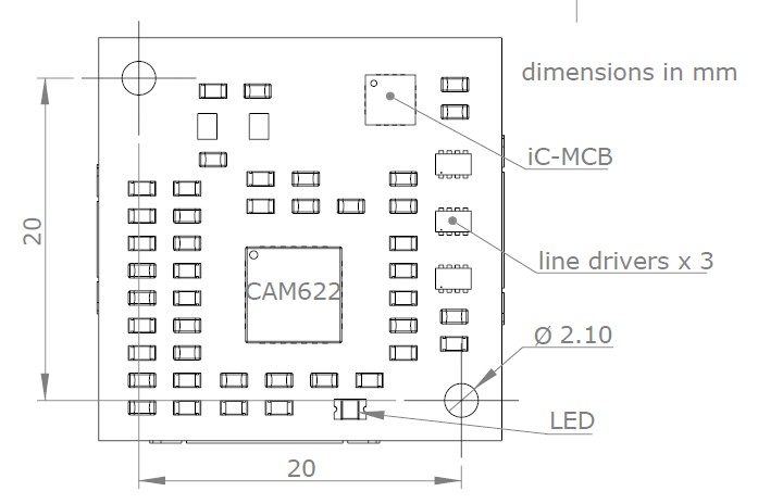 The CAM622 MultiComms Board includes the CAM622 IC itself, a step-down power supply for efficient operation from a 5 V input, line transceivers and an iC-Haus iC-MB to support BiSS communication. The BiSS interface uses the same 5 V differential signal lines as quadrature ABN. This reduces the board space needed for connectors, and allows ABN behaviour to be configured over the ABN lines themselves using BiSS.