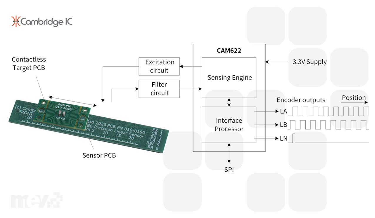 CambridgeIC’s CAM622 is a Resonant Inductive Encoder IC. It includes a Sensing Engine for measuring contactless position, and an Interface Processor that can generate encoder style outputs. The Sensing Engine connects to an external sensor. This detects the position of a contactless inductive resonant target. Both sensor and target are made from PCBs. They include coil patterns for resonant inductive sensing. These are available from CambridgeIC, so customers can manufacture the parts themselves and integrate them with their product. The CAM622 works with a variety of different sensor and target sizes. The Interface Processor can generate encoder style digital outputs, using an SPI interface for configuration and diagnostics. A host may alternatively use SPI as the primary interface, reading measurement results at high speed.