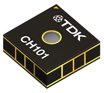 The CH101 is a miniature, ultra-low-power ultrasonic Time-of-Flight (ToF) range sensor. Based on Chirp’s patented MEMS technology, the CH101 is a system-in-package that integrates a PMUT (Piezoelectric Micromachined Ultrasonic Transducer) together with an ultra-low-power SoC (system on chip) in a miniature, reflowable package. The SoC runs Chirp’s advanced ultrasonic DSP algorithms and includes an integrated microcontroller that provides digital range readings via I2C.