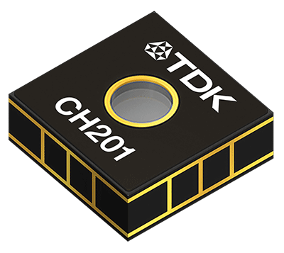 CH201 is a miniature, ultra-low power, long-range ultrasonic Time-of-Flight (ToF) range sensor. Based on Chirp’s patented MEMS technology, the CH201 is a system-in-package that integrates a PMUT (Piezoelectric Micromachined Ultrasonic Transducer) together with an ultra-low power SoC (System on Chip) in a miniature, reflowable package. The SoC runs Chirp’s advanced ultrasonic DSP algorithms and includes an integrated microcontroller that provides digital range readings over I2C.