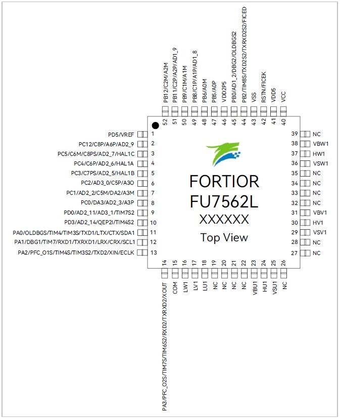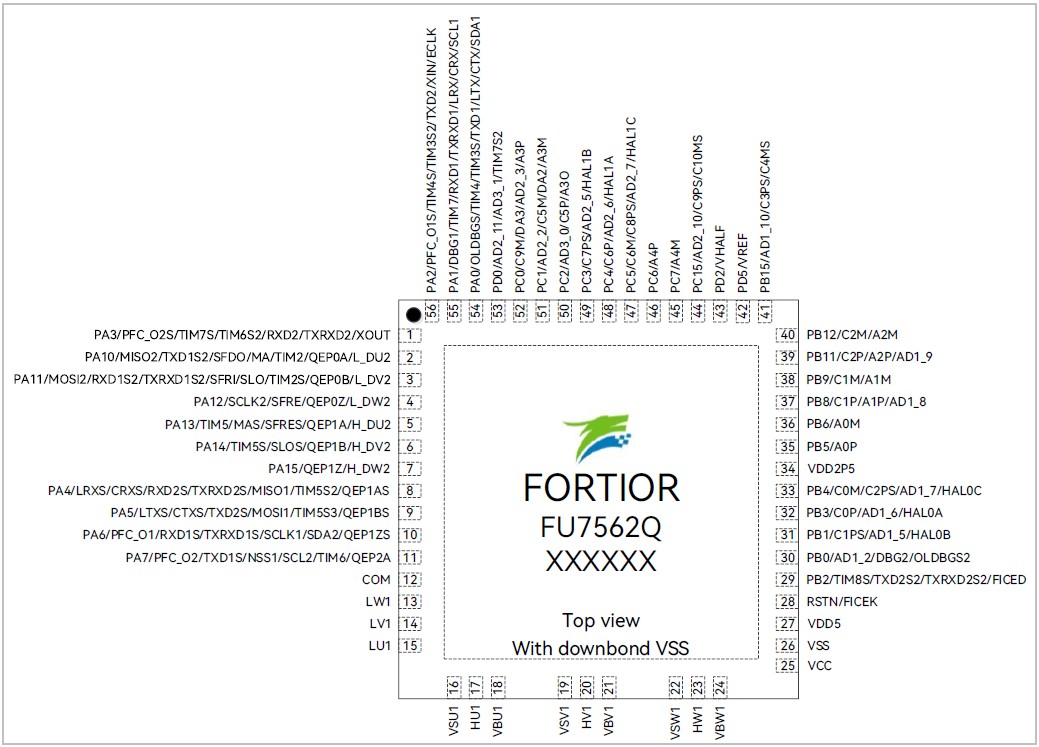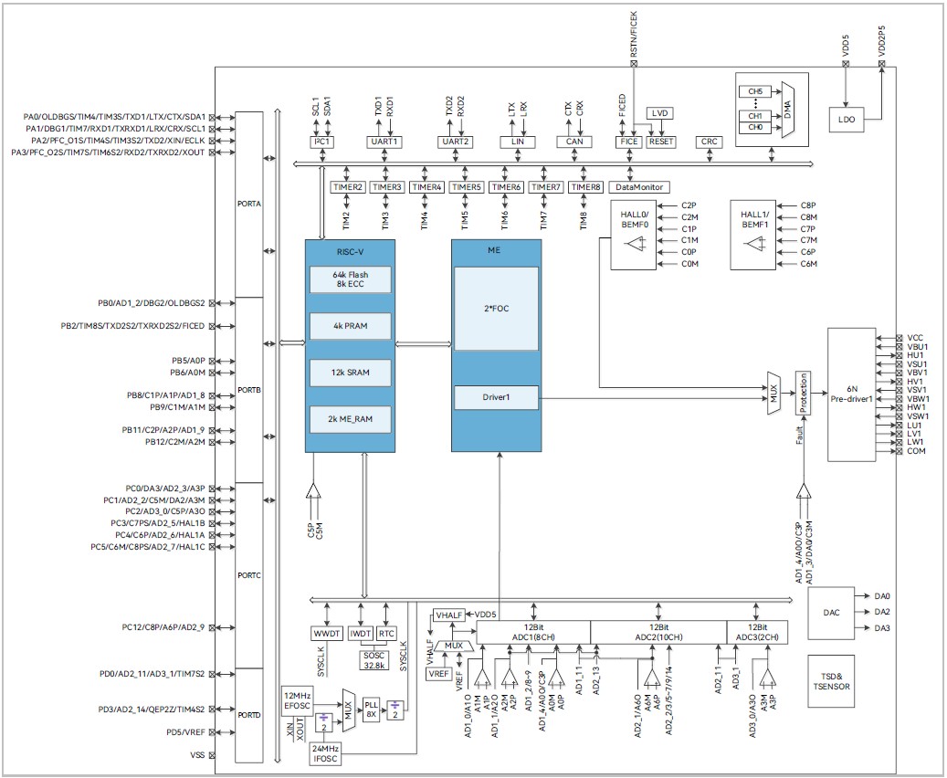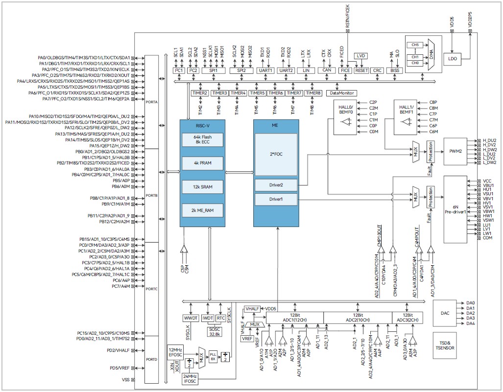 The high-performance motor drive chip incorporates ME core and RISC-V core. ME core integrates FOC module and CORDIC module that allow for automatic calculation of FOC or square-wave control by the hardware for sensored/sensorless BLDC/PMSM motors. RISC-V core is used for parameter configuration and routine processing. The dual cores work in parallel to achieve high-performance motor control. Interleaved two-phase boost PFC. The chip integrates high-speed operational amplifiers, comparators, high-speed ADC, CRC, SPI, I2C, UART, LIN, CANFD, DataMonitor, Timers, built-in LDO, which are suitable for FOC or square-wave based BLDC/PMSM motors.