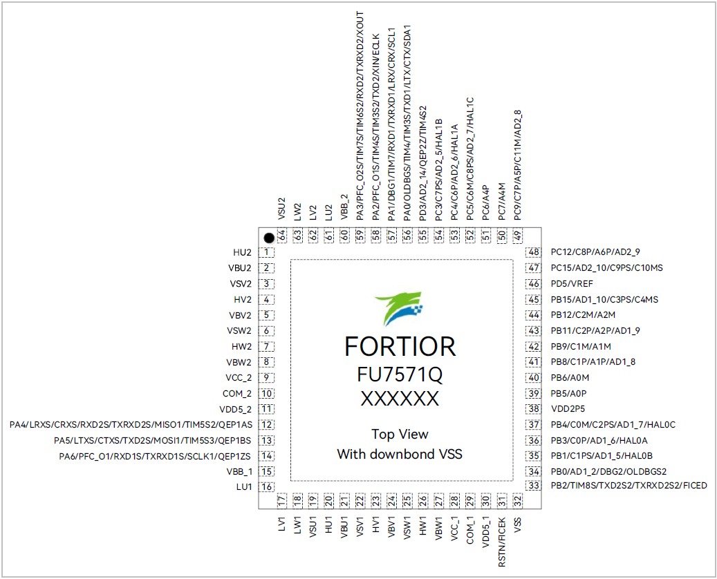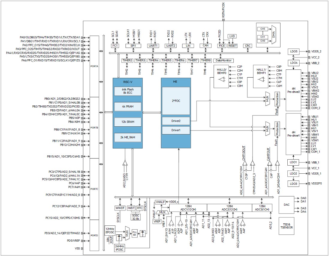 The high-performance motor drive chip incorporates ME core and RISC-V core. ME core integrates FOC module and CORDIC module that allow for automatic calculation of FOC or square-wave control by the hardware for sensored/sensorless BLDC/PMSM motors. RISC-V core is used for parameter configuration and routine processing. The dual cores work in parallel to achieve high-performance motor control. Interleaved two-phase boost PFC. The chip integrates high-speed operational amplifiers, comparators, high-speed ADC, CRC, SPI, I2C, UART, LIN, CANFD, DataMonitor, Timers, built-in LDO, which are suitable for FOC or square-wave based BLDC/PMSM motors.