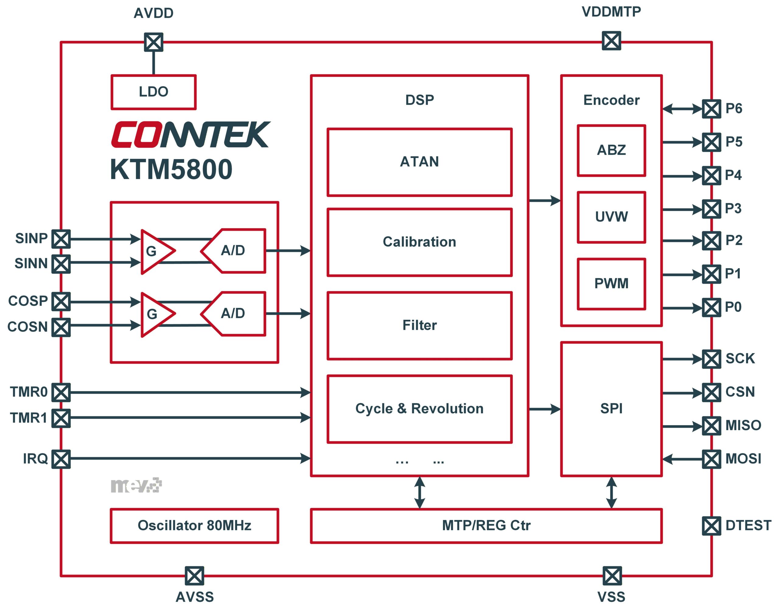 Additional features of KTM5800 include automatic linear and non-linear calibration, Z signal calibration, absolute position synchronization for multi-pole applications, automatic AMR matching for orthogonal signal calculation, and programmable operational amplifier gain. KTM5800 has made some optimizations to its functional safety, such as the SPI angle output communication with an 8-bit CRC verification and the integration of many self diagnostic alarm functions, such as AMR Input Sine/Cosine Amplitude Anomaly,Input Undervoltage Detection,Excessive Filter Lag,etc.