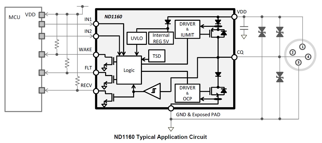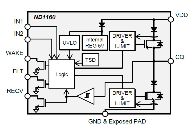 ND1160 is an IO-Link device transceiver using Bi-CMOS process. The current capacity is 200 mA and the operating voltage range is guaranteed from 8.5 V to 36 V. High-side, low-side, and push-pull operation can be set depending on the logic of the input terminal. Compliant with IO-Link standard and can detect the status of connected devices. In addition, the ND1160 is integrated the over current protection, the thermal shutdown and reverse current protection.